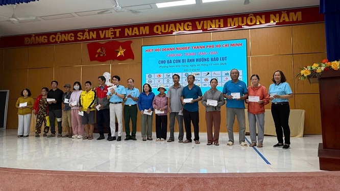 Tiếp tục chương trình, ngày 2,3/12, đoàn Hiệp hội Doanh nghiệp TP. Hồ Chí Minh đến thăm và tặng 500 triệu đồng tiền mặt (mỗi hộ 1 triệu đồng tiền mặt) cho bà con tỉnh Khánh Hòa bị ảnh hưởng bão lũ. Trong đó, tặng 200 phần quà cho người dân Tổ dân phố Ngọc Hội 1 (phường Tây Nha Trang); tặng 150 phần quà cho người dân các tổ dân phố: Thái Thông 1, Thái Thông 2, Thủy Tú, Vĩnh Xuân, Đất Lành (phường Nam Nha Trang); tặng 150 phần quà cho người dân xã Suối Hiệp chịu thiệt hại do mưa lũ. Tại các nơi đến thăm, các thành viên của hiệp hội đã chia sẻ những khó khăn, mất mát; động viên người dân các địa phương sớm vượt qua khó khăn, ổn định lại cuộc sống.