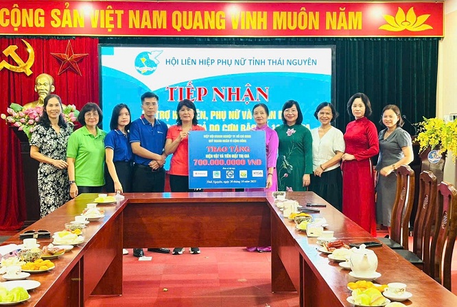Bà Hà Thị Đào - Phó Chủ tịch Ủy ban MTTQ Việt Nam tỉnh, Chủ tịch Hội LHPN tỉnh Thái Nguyên đã đại diện tỉnh Thái Nguyên tiếp nhận nguồn kinh phí 700 triệu đồng từ HUBA và các đơn vị tài trợ.