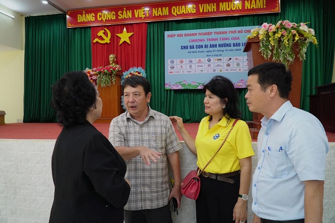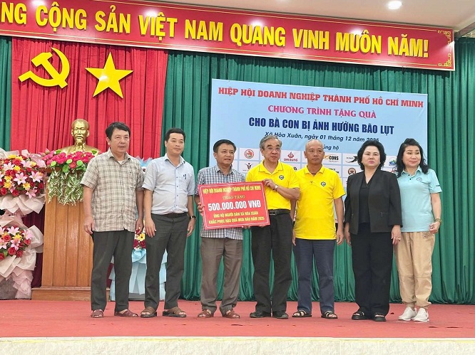 Hưởng ứng lời kêu gọi của Uỷ ban MTTQ Việt Nam về việc hỗ trợ khẩn cấp cho các địa phương chịu thiệt hại nặng trong đợt lũ cuối tháng 11. Từ ngày 1 đến 3/12, đoàn công tác Hiệp hội Doanh nghiệp TP.HCM (HUBA) do Ông Nguyễn Ngọc Hoà - Chủ tịch HUBA làm trưởng đoàn và Bà Lã Thị Lan - Phó Chủ tịch HUBA, Chủ tịch Quỹ Doanh nhân vì cộng đồng; Bà Lý Kim Chi – Phó Chủ tịch HUBA; Chủ tịch Hiệp hội Lương thực Thực phẩm TP.HCM; Ông Trần Việt Anh – Phó Chủ tịch HUBA; Chủ tịch Hội Doanh nghiệp Đông Sài Gòn; Ông Phan Đình Tuệ - Phó Chủ tịch HUBA, Chủ tịch Hội Doanh nghiệp Nghệ Tĩnh tại TP.HCM; Bà Trần Diệu Canh - Ủy viên BCH HUBA, Phó Chủ tịch Quỹ DNVCĐ, Phó Chủ tịch Hội Doanh nghiệp Cơ khí - Điện TP.HCM; Ông Lê Tấn Nam - Ủy viên BCH HUBA, Chủ tịch Hội Doanh nghiệp Tây Bắc Sài Gòn; Bà Lê Thị Thu Hương - Ủy viên BCH HUBA, Chủ tịch Hội Tư vấn và Đại lý thuế TP.HCM; Bà Hoàng Thị Bích Thảo - Uỷ viên BCH HUBA, Phó Chủ tịch Hội Doanh nghiệp Đông Sài Gòn; Ông Nguyễn Viết Toàn - Ủy viên BCH HUBA, Phó Chủ tịch Hội Doanh nghiệp Tây Sài Gòn; Bà Lâm Thuý Ái - Uỷ viên BCH HUBA, Chủ tịch HĐTV Công ty TNHH SX-TM Mebipha; Ông Nguyễn Chính Hải - Uỷ viên BCH HUBA; Ngô Văn Điệp – Tổng Thư ký HUBA, Phó Chủ tịch Hội Doanh nghiệp Nam TP.HCM; Bà Cao Thị Nhung – Phó Giám đốc thường trực Quỹ DNVCĐ; Bà Dương Xuân Hồng – Phó Chủ tịch Chi hội Sen Vàng cùng Hội Doanh nghiệp khu vực Gia Định và các Hội, CLB thành viên HUBA, các đơn vị tài trợ và các Doanh nhân, Doanh nghiệp, Mạnh thường quân tổ chức đoàn công tác đến tỉnh Đắk Lắk (Phú Yên cũ) và tỉnh Khánh Hoà để thăm hỏi và trao quà cho người dân đang gặp khó khăn.
